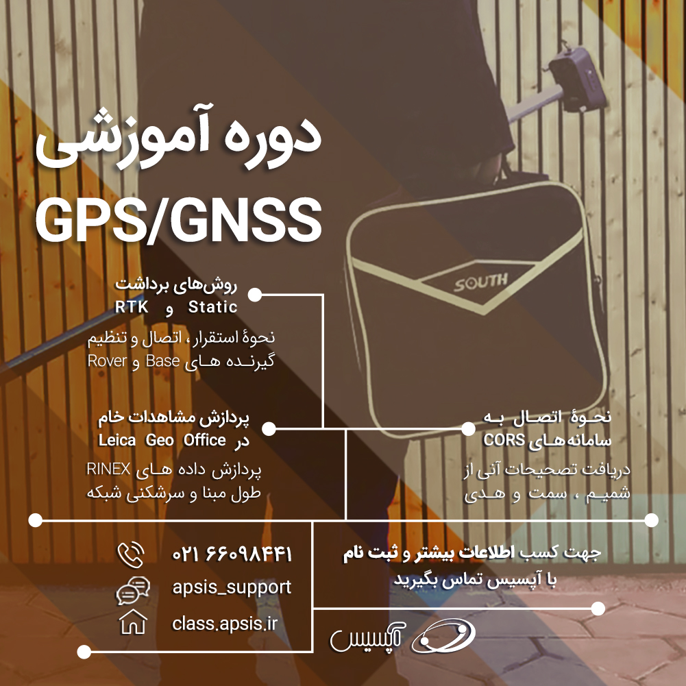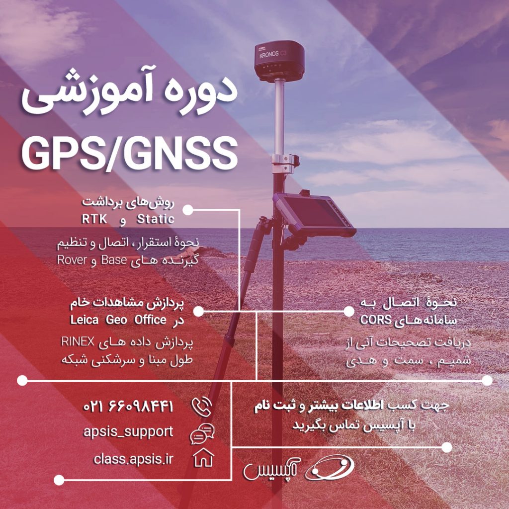 دوره کار با دستگاه GPS به صورت تئوری و عملی یکی از دوره های آموزشی نرم افزارهای تخصصی و تجهیزات نقشه برداری مدرسه آپسیس است و شامل سرفصل های مروری بر انواع روش های موقعیت یابی، سیستم های مختصات و سامانه های مکان یابی، آشنایی با اصطلاحات فنی جی پی اس و گیرنده های GPS/GNSS، نحوۀ استقرار و اتصال دستگاه، تنظیمات نرم افزار و ایجاد ارتباط بین گیرنده ها، برداشت Online RTK, RTK, Static و آموزش نرم افزار پردازش داده ها است.